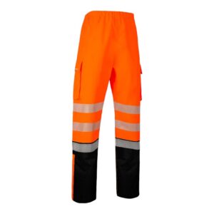 Fully compliant with EN ISO 20471 Class 2 and RIS-3279-TOM (orange only) standards, these overtrousers feature 60mm segmented reflective tape for maximum visibility. Practical design elements include two hip storm flap pockets for internal access, two large combat pockets with hook and loop bellows closures, and contrast panels in high-soil areas for a cleaner appearance. Generous sizing ensures compatibility with other garments, and fully taped seams offer additional waterproof protection.