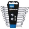 Supplied on a wall-mountable plastic rack, this set keeps your tools organised and easily accessible. The contents include spanners in the following sizes: 6 mm x 7 mm, 8 mm x 9 mm, 10 mm x 11 mm, 12 mm x 13 mm, 14 mm x 15 mm, 16 mm x 17 mm, 18 mm x 19 mm, and 20 mm x 22 mm, providing a comprehensive range for various applications.