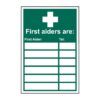 “First Aid – Your First Aiders Are” sign, BS 5499 and ISO 7010 compliant, displays names of first aiders for clear identification during emergencies.