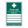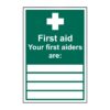 “First Aid – Your First Aiders Are” sign, BS 5499 and ISO 7010 compliant, displays names and telephone numbers of first aiders for quick identification during emergencies.