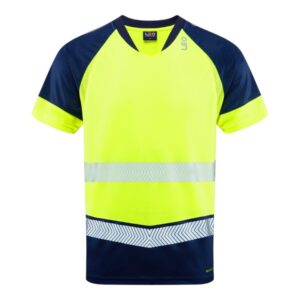 The t-shirt features segmented reflective tape, which provides enhanced visibility while maintaining garment stretch for unrestricted movement. A split hem and extended back offer additional coverage and comfort during physical tasks. With a navy print contrast fabric, this t-shirt combines functionality with style, making it a practical choice for demanding work environments.