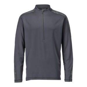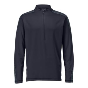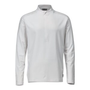 The design features a modern fit with a turtleneck collar and short zip, allowing for adjustable ventilation and a sleek, athletic profile. A neckband adds comfort, while the garment’s moisture-wicking properties help regulate body temperature and keep you dry throughout the day.