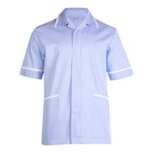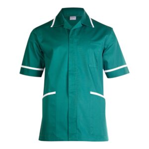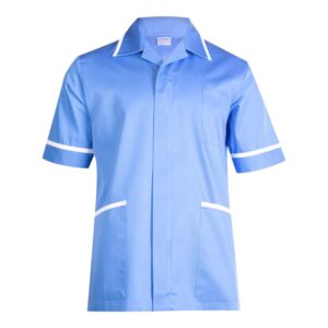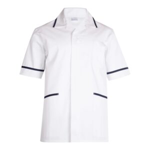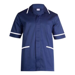 Uneek Mens Heavyweight Tunic with front zip, contrast trim, chest and hip pockets, and action back pleats. Durable polycotton blend for professional healthcare wear.
