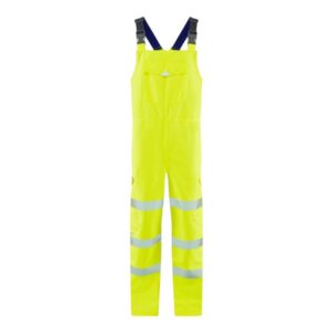 Designed for practicality, it features adjustable elasticated shoulder straps with soft-touch rubber buckles for a comfortable fit, and a raised back with an elasticated waist for added coverage and flexibility. A side zip from underarm to waist allows for easy wear and removal, while large cargo pockets with hook and loop fastened flaps and reflective tipping provide ample storage. Additional functional details include lower leg zip openings with hook and loop storm flaps and heat-applied segmented reflective tape for enhanced visibility.